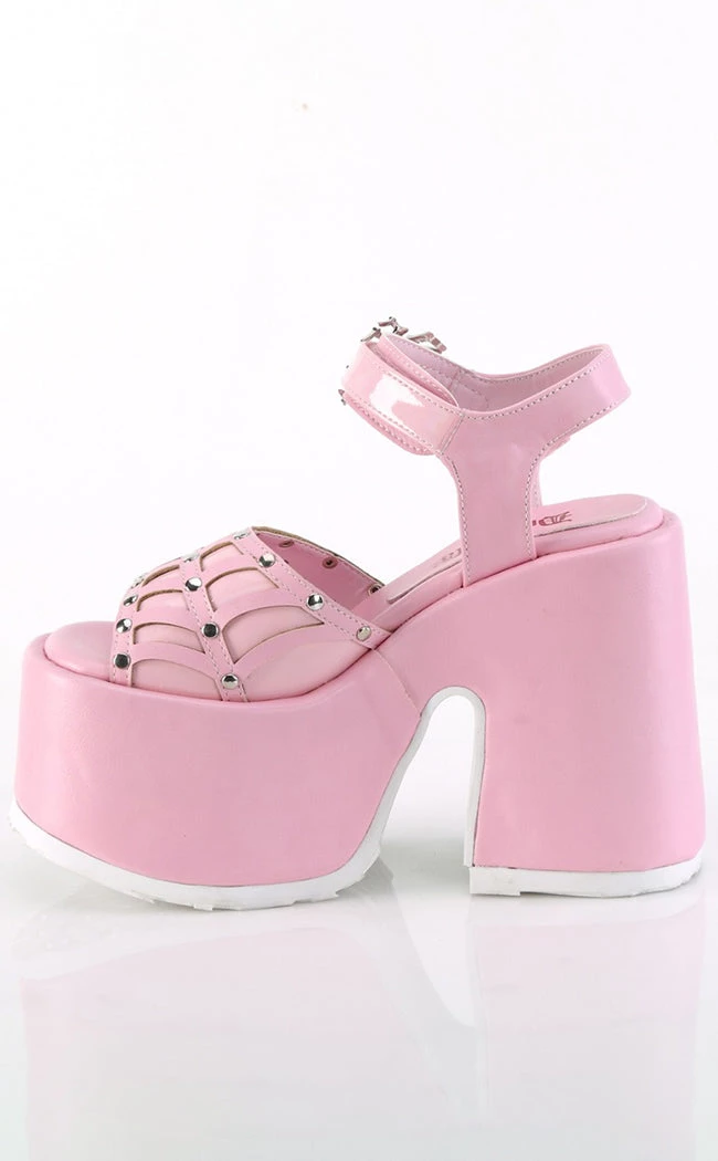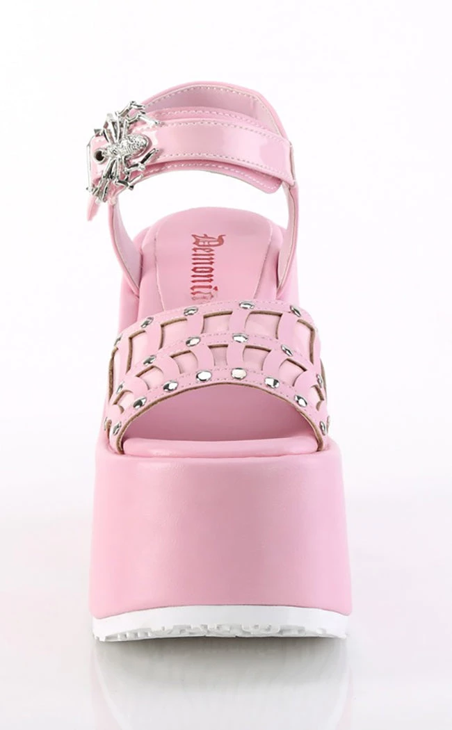 Spin a web in the CAMEL-17 platform sandals! These chunky cuties feature a patent spiderweb detail and studs on the vampΒ while the ankle strap secures with a spider buckle. An absolute must for summergoth styling!