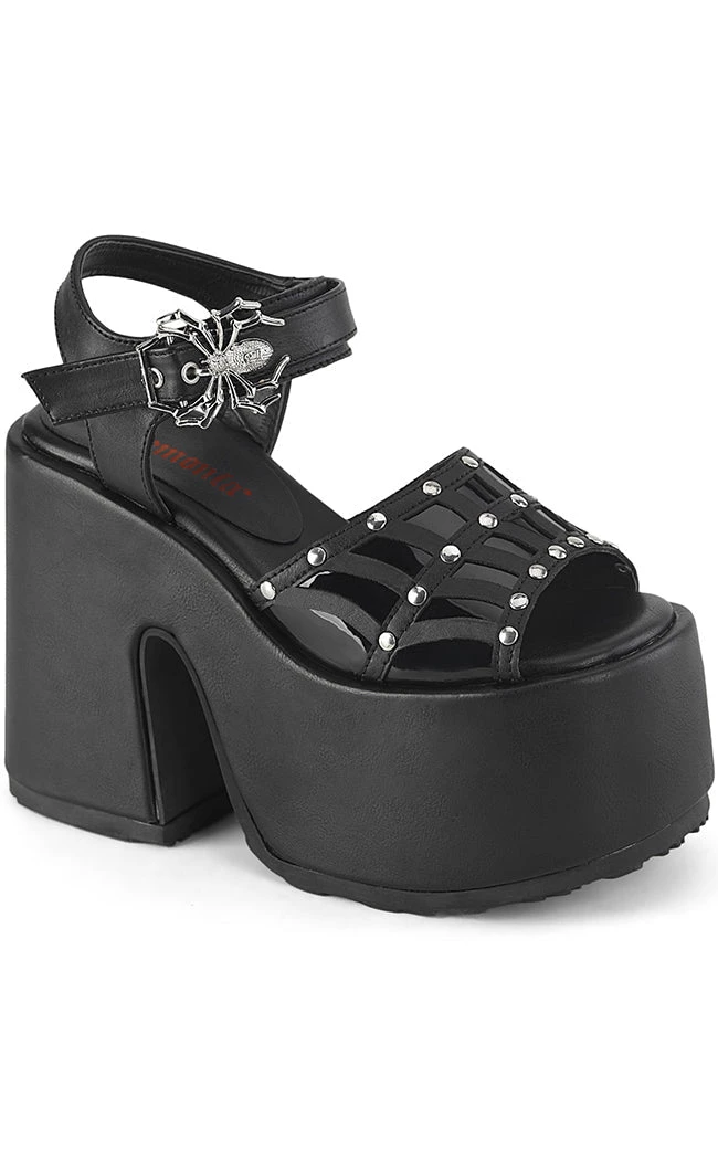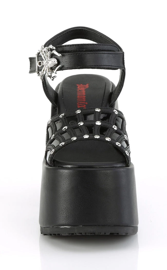 Spin a web in the CAMEL-17 platform sandals! These chunky cuties feature a patent spiderweb detail and studs on the vampΒ while the ankle strap secures with a spider buckle. An absolute must for summergoth styling!