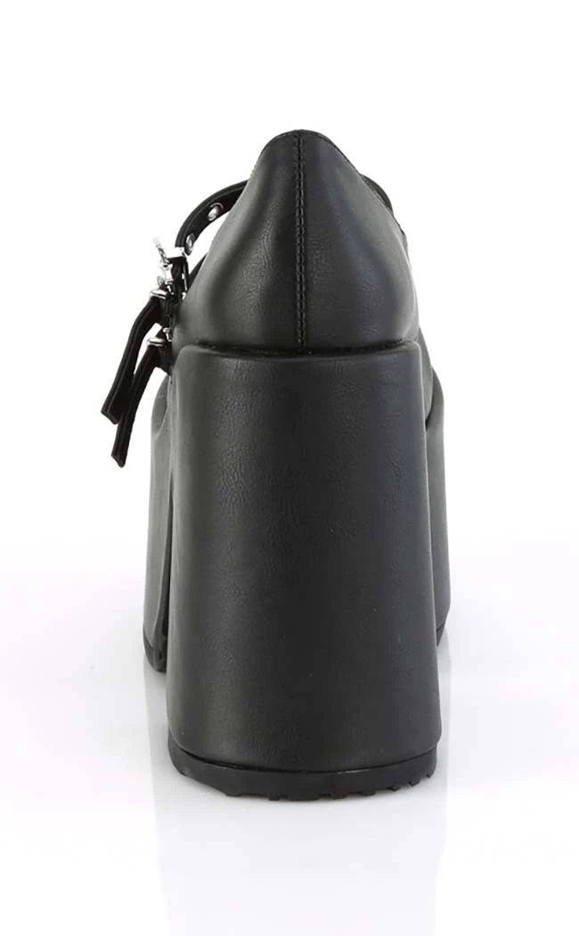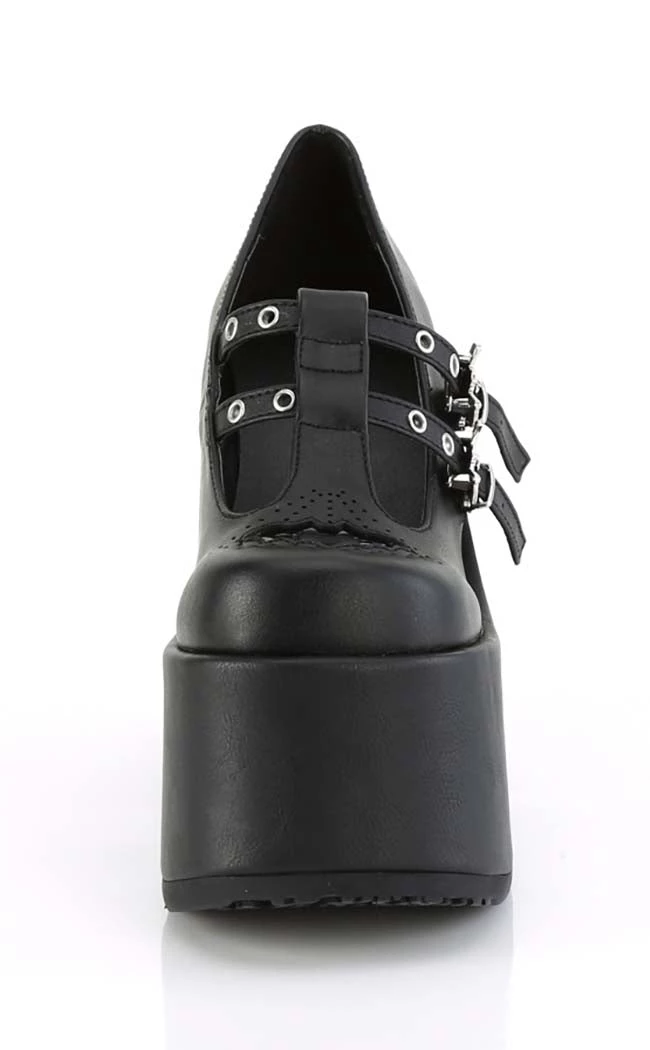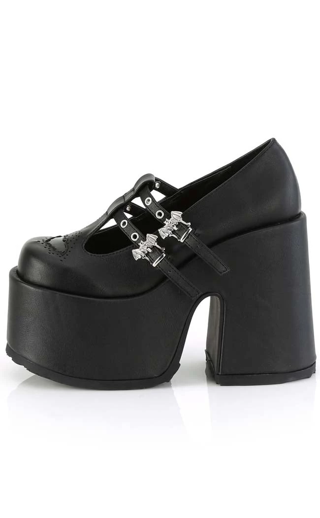Take flight in the CAMEL-55 platforms! These chunky mary janes are super chic and wicked cute, featuring a double T strap that secures with adorable bat buckles. A bat cutout on the vamp is a final touch of gothic sweetness to level up any outfit. Pair with puffy skirts and frilly socks!
