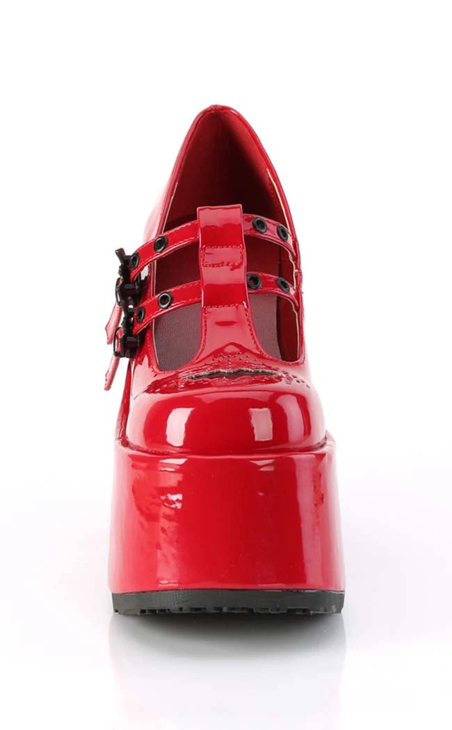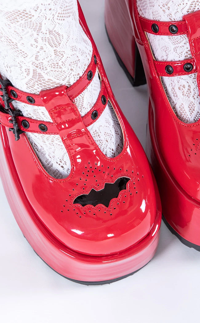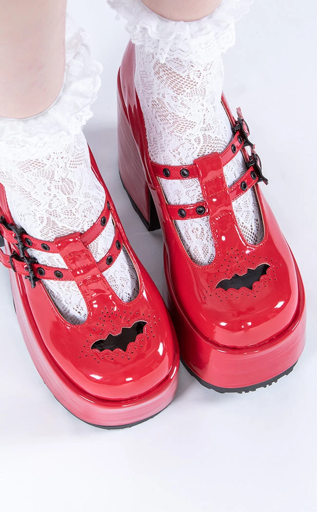 Take flight in the CAMEL-55 platforms! These chunkyΒ mary janes are super chicΒ and wicked cute, featuring a double T strap that secures with adorable bat buckles. AΒ bat cutout on the vamp is a final touch of gothic sweetness to level up any outfit. Pair with puffy skirts and frilly socks!