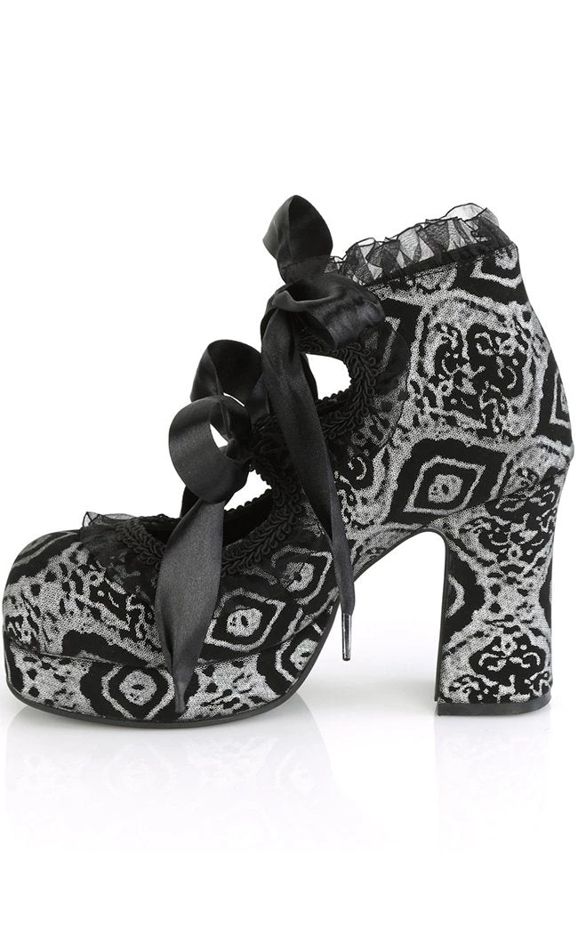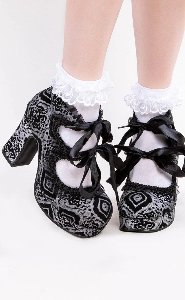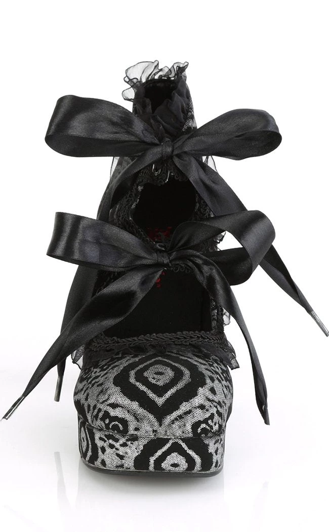 Get fancied up in the GOTHIKA-53 heels!Β Luxe faux black & silver nubuck leather takes centre stage, trimmed with ruffles and flowing ribbon ties.