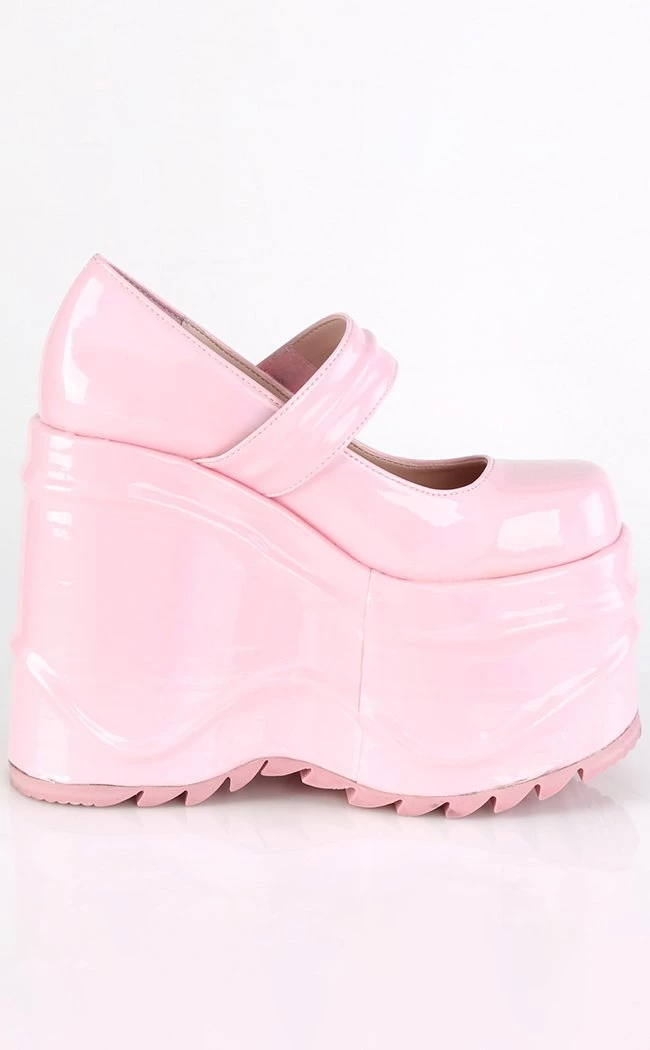 Don’t just make waves, generate tsunamis!Β You’ll quake the earth stomping around in these gigantic 6 inch wedges.Β These boots do up with a velcro strap, making them super easy to slip in and out of.Β The cute baby pink and out there holo finish is just an extra cyber bonus, perfect for cosplay and festival looks!